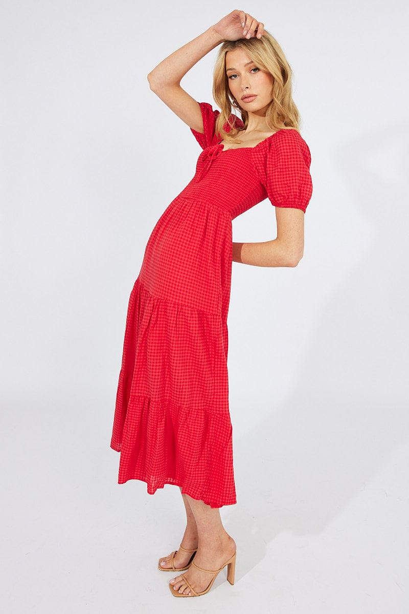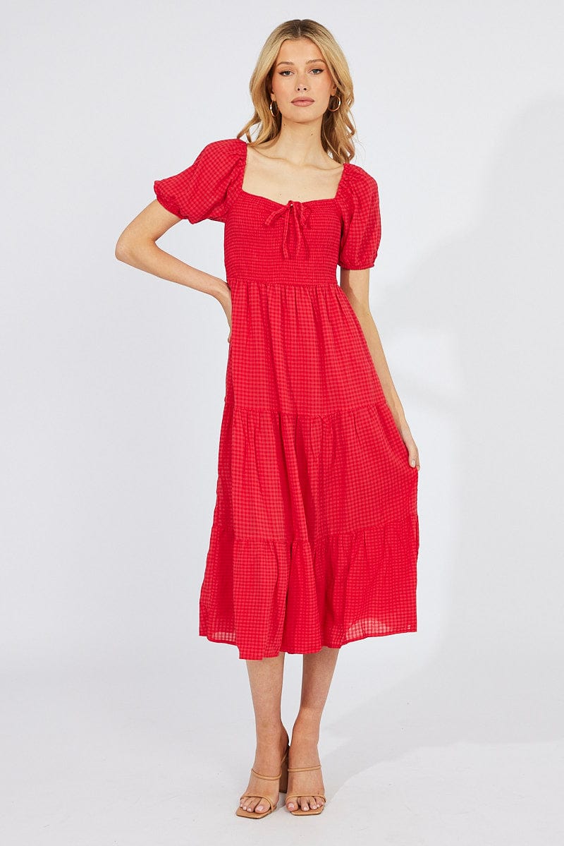 Red Midi Dress Short Sleeve Shirred